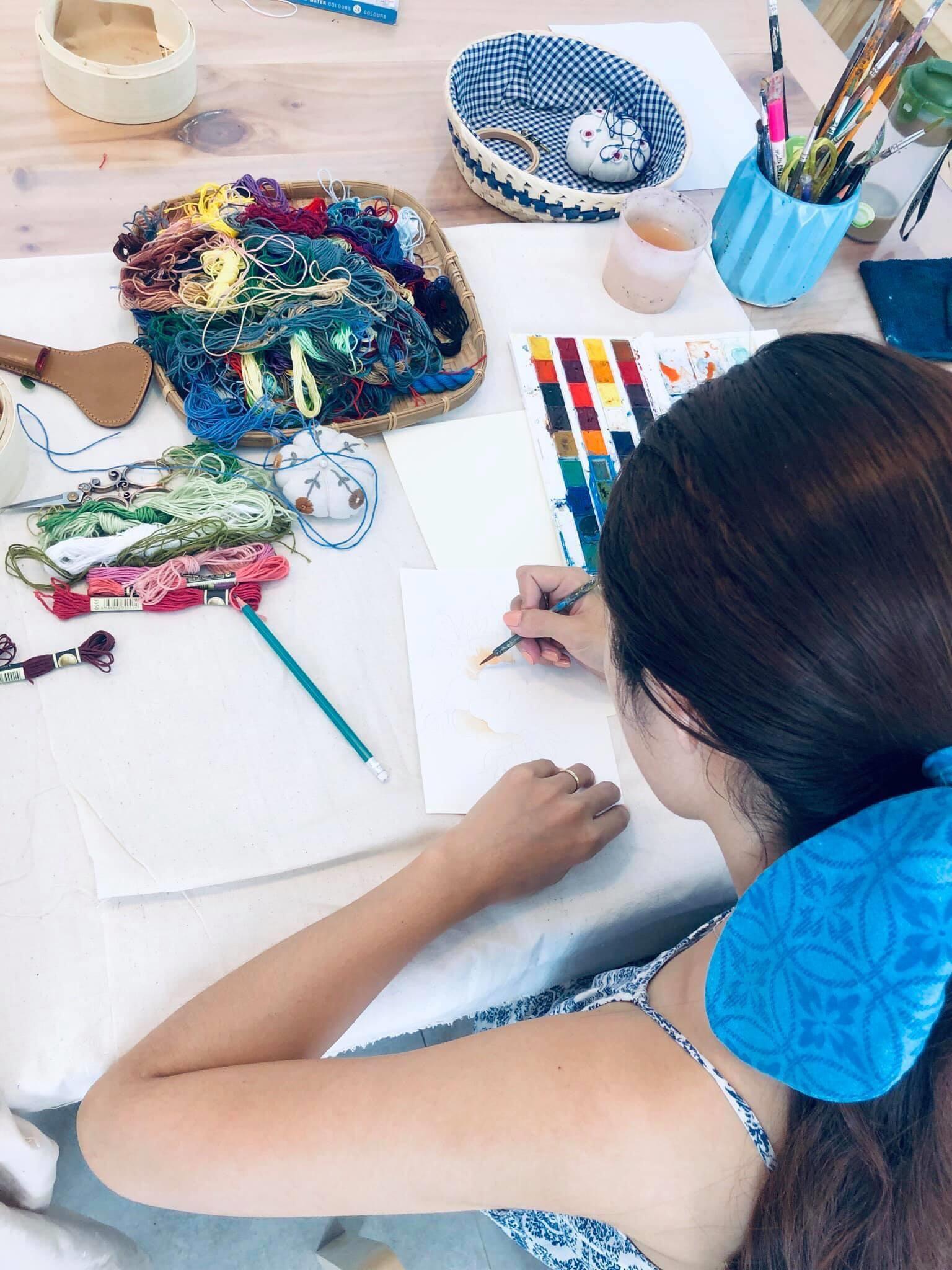 Song song với dạy vẽ Nhà còn đưa bạn trải nghiệm nhiều hoạt động liên quan thông qua các workshop dạy thêu, may, vẽ lên túi, vẽ màu sáp,nặn đất sét,làm các món thủ công xinh xắn như thiệp, lịch…
